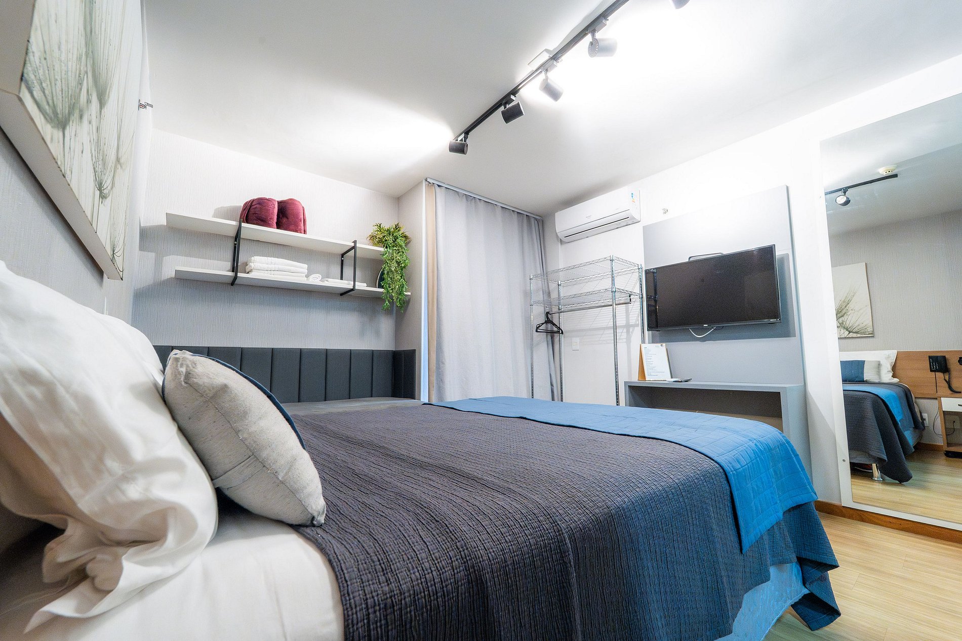 Apartamento de 24m² possui cama de casal queen com duas camas auxiliares embaixo, banheiro e cozinha equipada com geladeira, fogão duas bocas, sanduicheira, cafeteira Dolce Gusto, utensílios de cozinhas básicos como panelas, copos, pratos e talheres, Disponibilizamos uma cafeteira Dolce Gusto para maior conforto dos hóspedes. As cápsulas devem ser providenciadas pelos próprios hóspedes. Ferro de passar disponível mediante solicitação prévia. Tv Com Play. *Piscina aquecidas disponíveis para acesso dos hóspedes. Direito a uma vaga de garagem no estacionamento rotativo do condomínio.