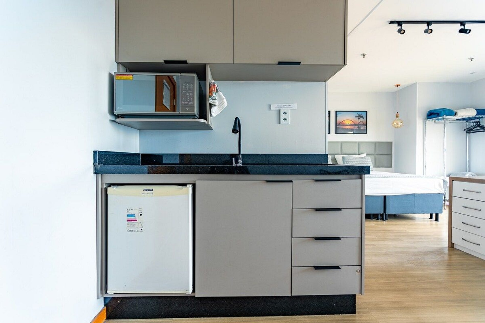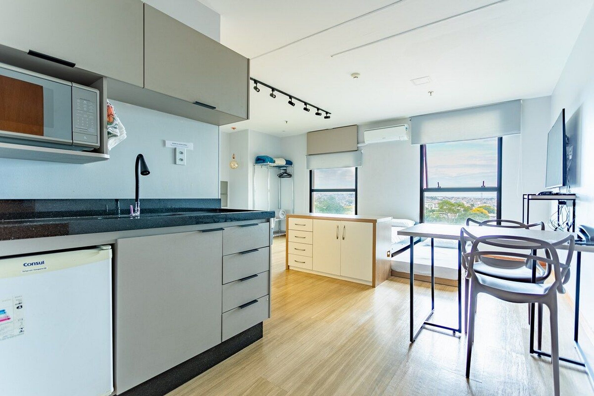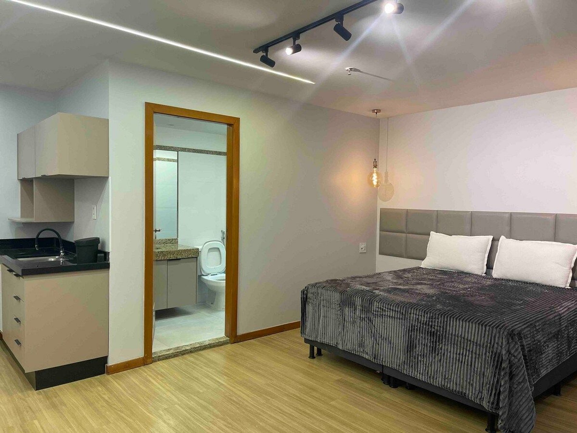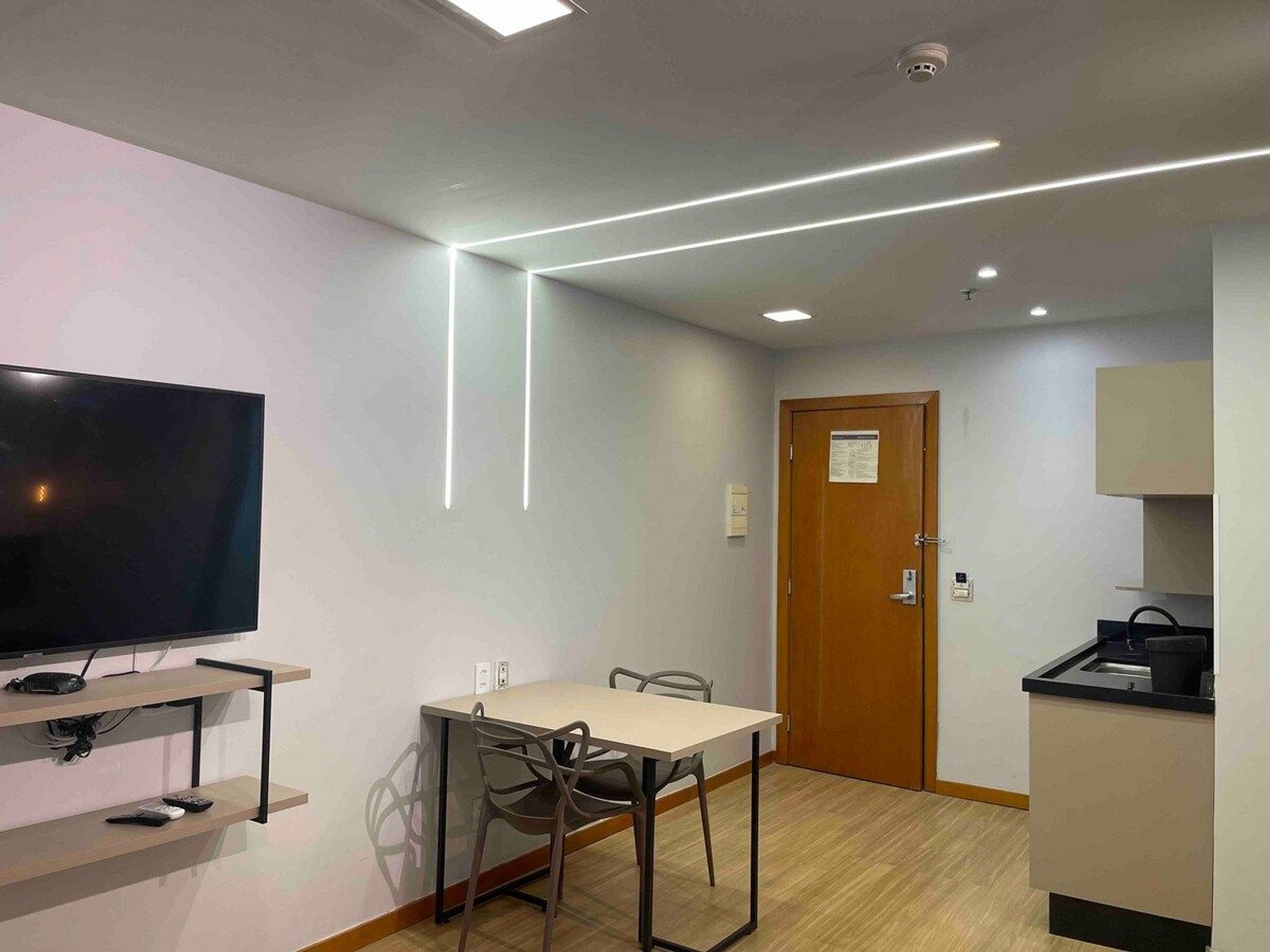 Espaço amplo 33 metros, pequena cozinha para lanches e refeições rápidas, TV 58 polegada Wi fi, e Tv a cabo