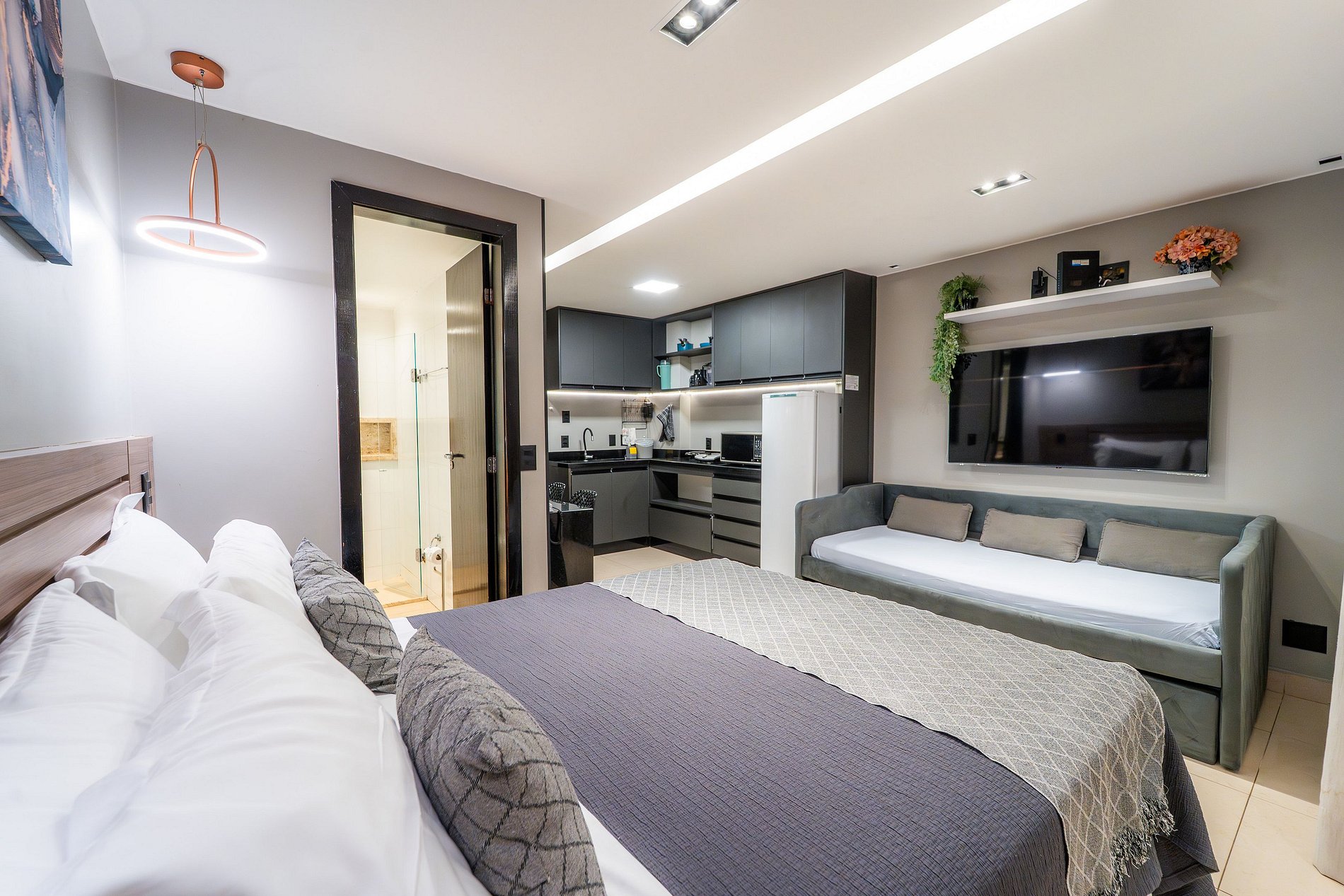 Apartamento de 32m² possui cama de casal queen, sofá-cama casal e colchão, banheiro e cozinha equipada com geladeira, fogão uma boca de indução, sanduicheira, utensílios de cozinhas básicos como panelas, copos, pratos e talheres. Ferro de passar.