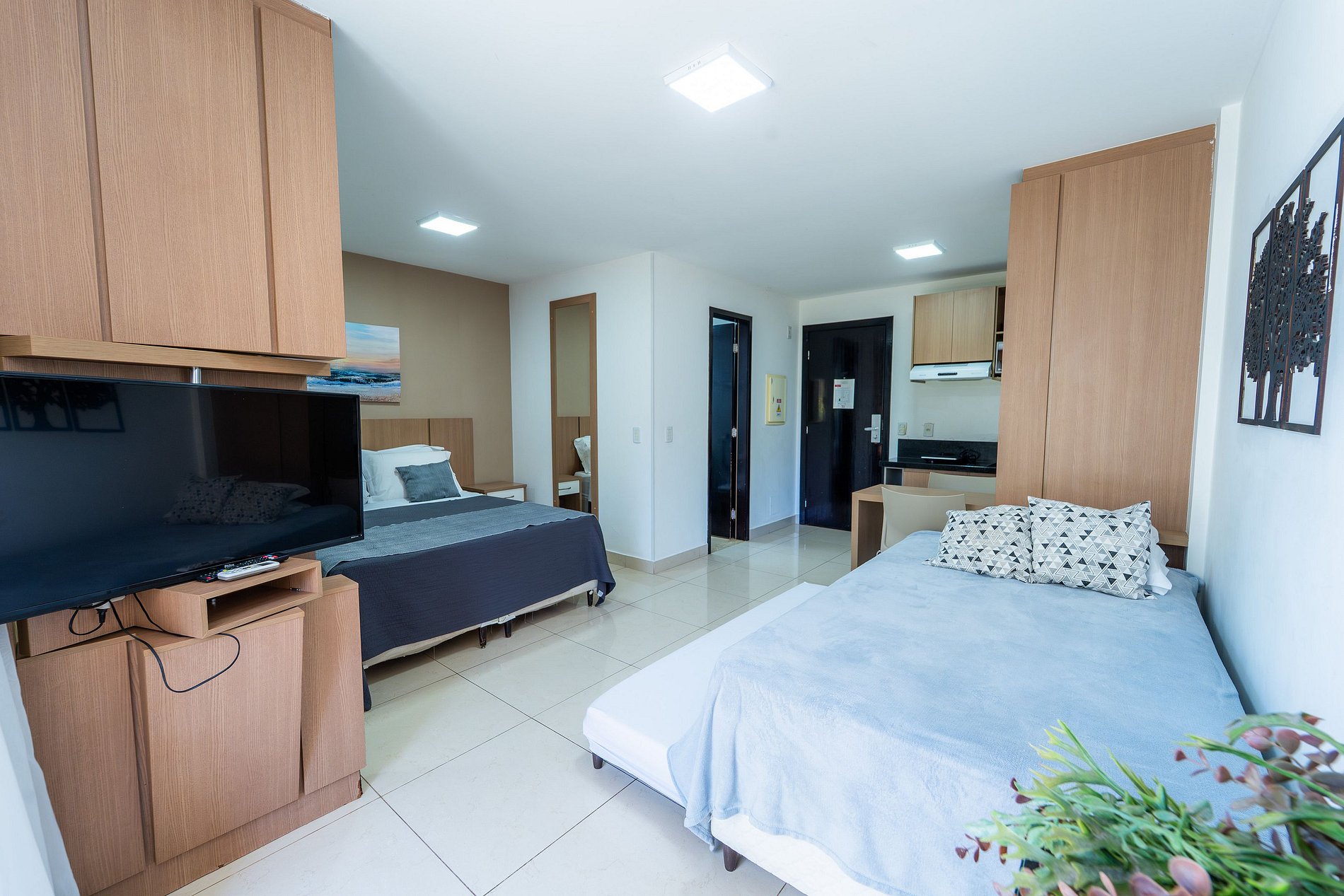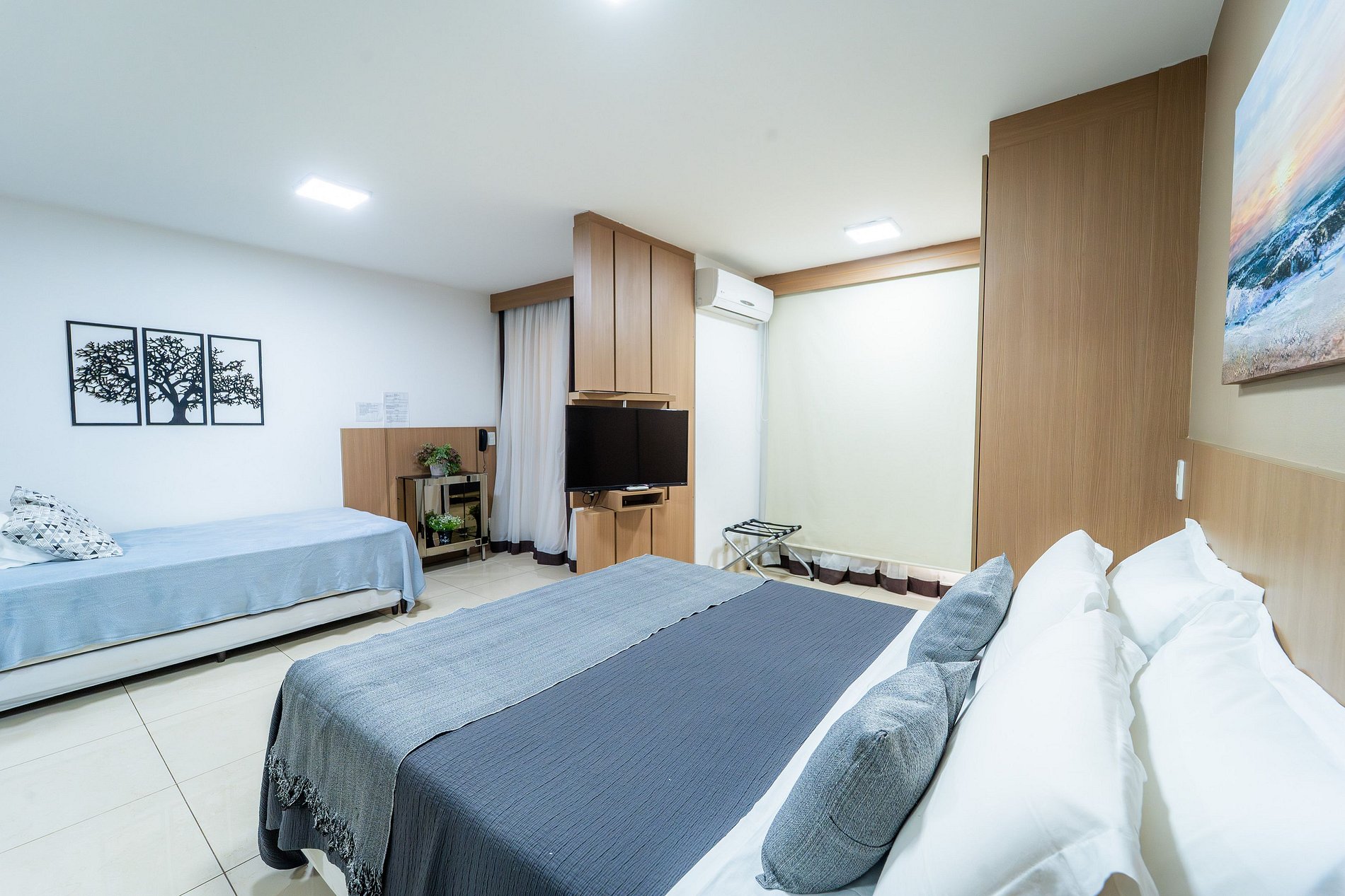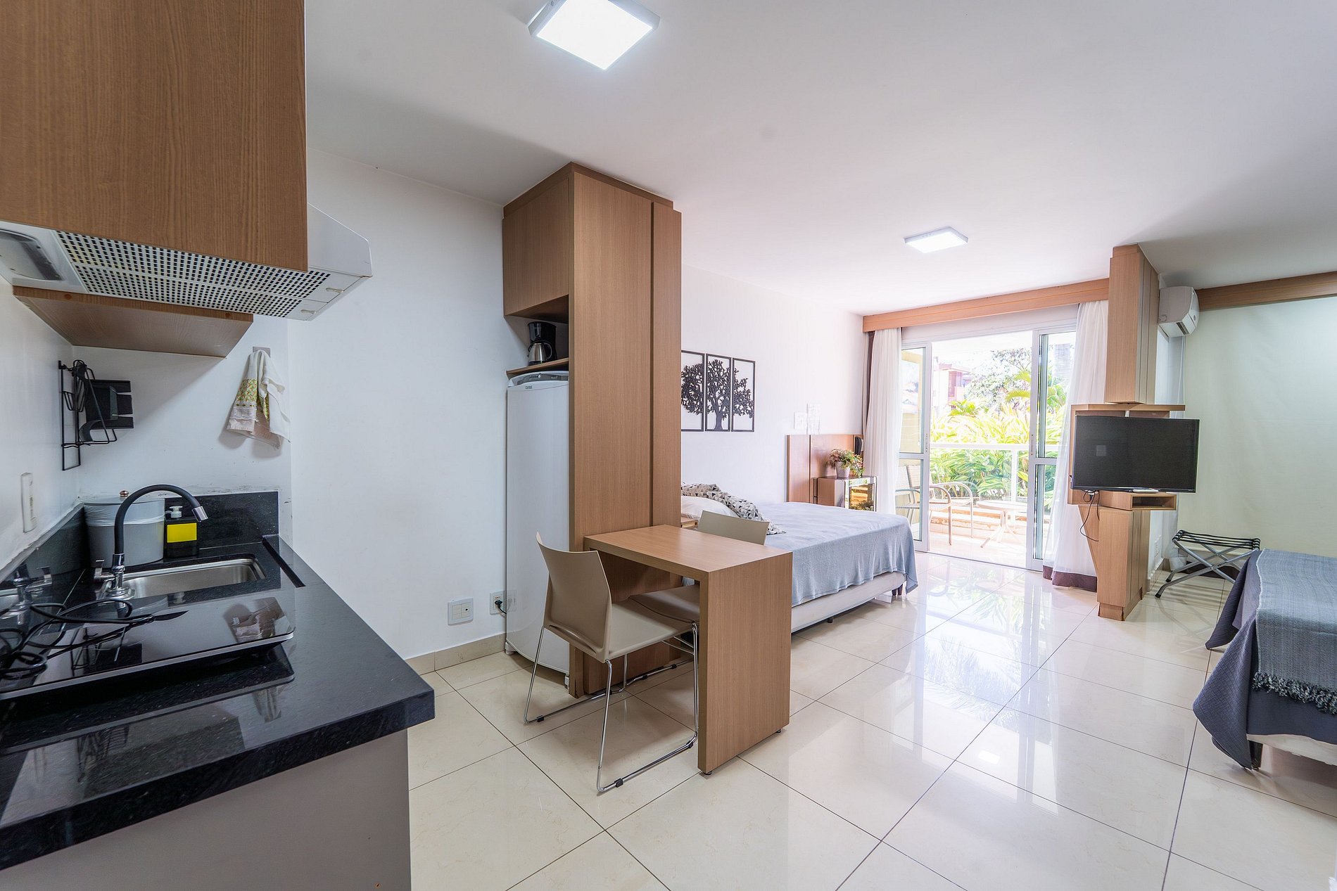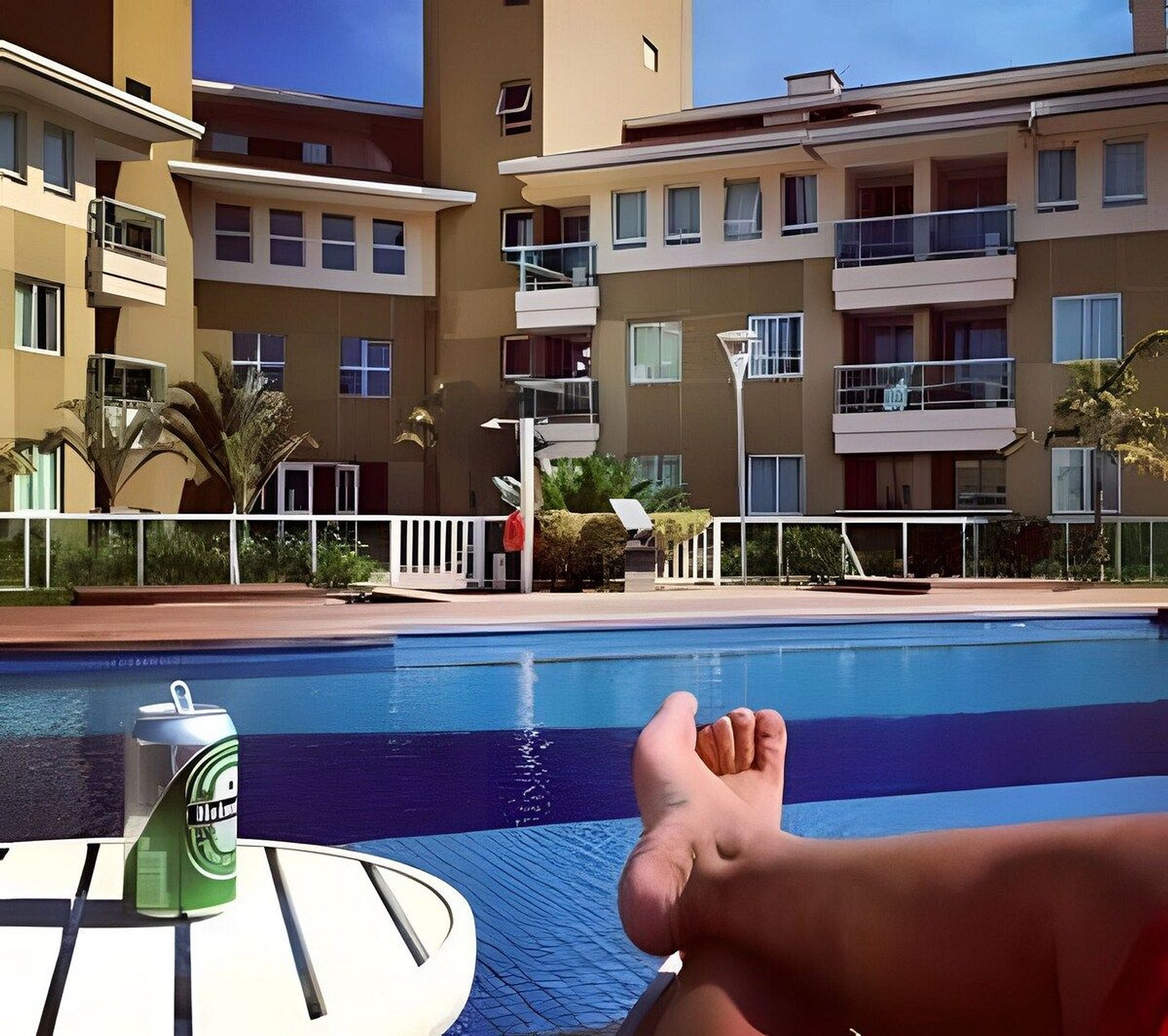 Apartamento de 36m² no térreo possui cama de casal queen, sofá cama casal e dois colchões, banheiro e cozinha equipada com geladeira, fogão duas bocas, sanduicheira, utensílios de cozinhas básicos como panelas, copos, pratos e talheres. Ferro de passar disponível mediante solicitação prévia. Tv com Globo Play. *Piscina climatizadas disponíveis para acesso dos hóspedes. Direito a uma vaga de garagem no estacionamento rotativo do condomínio.