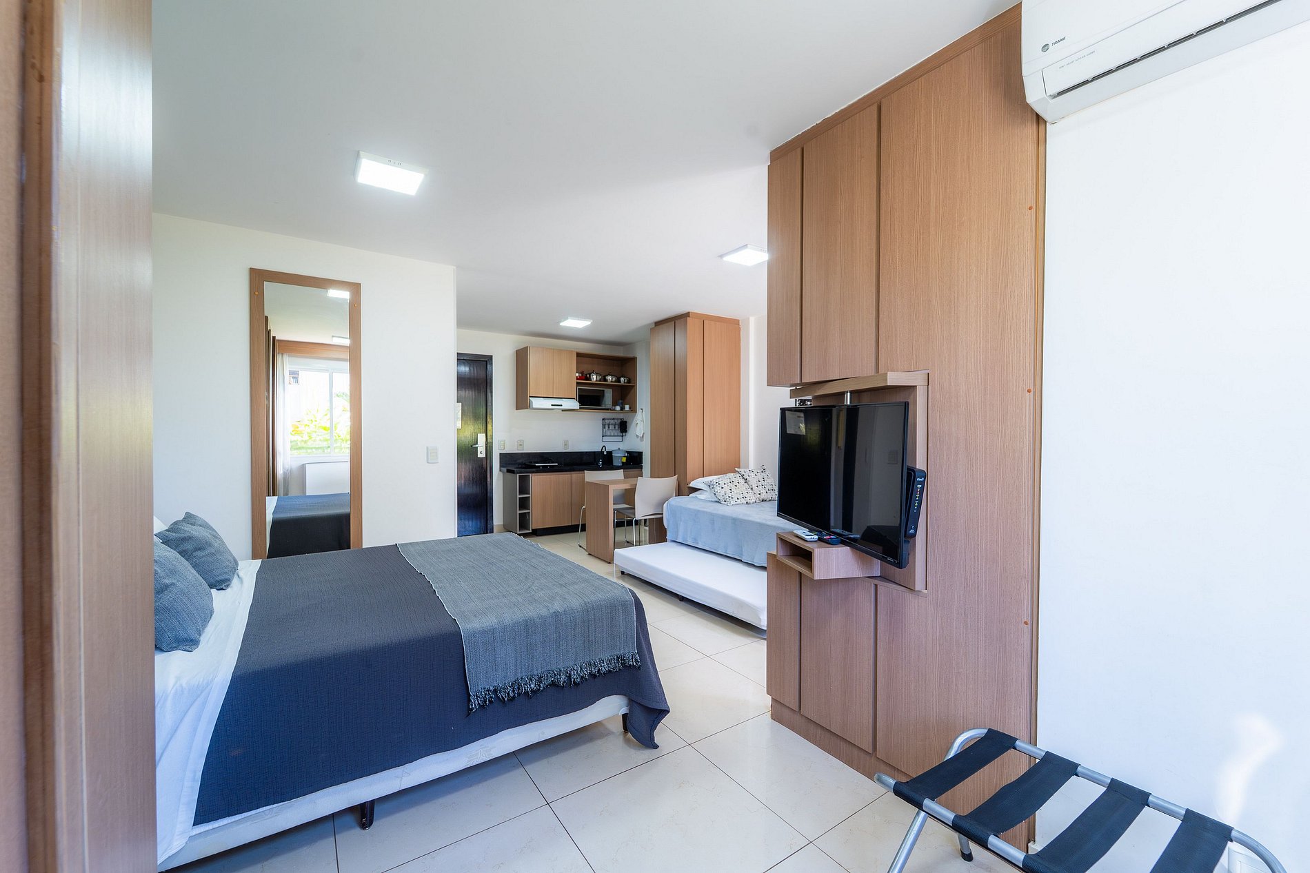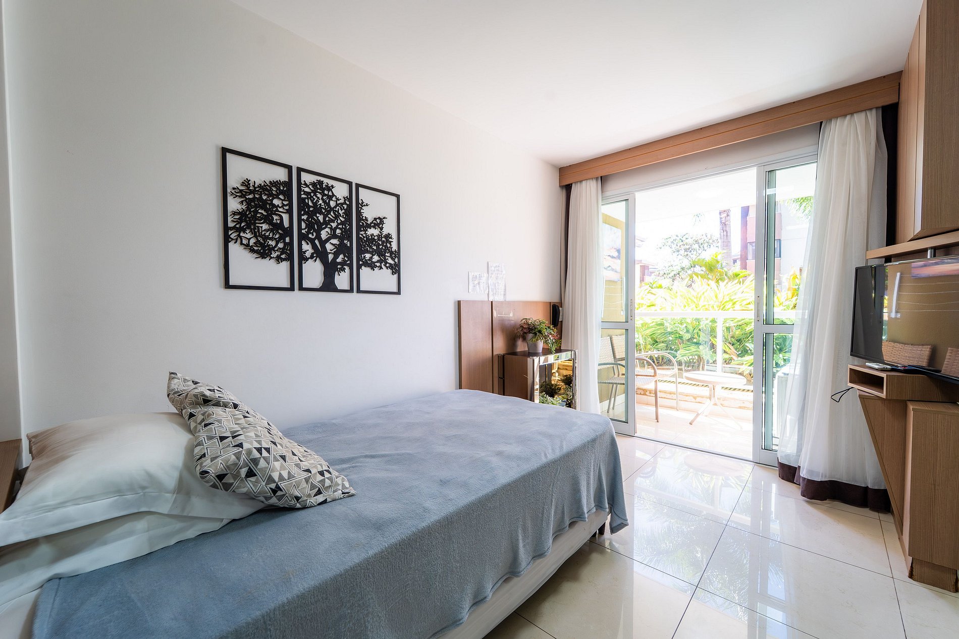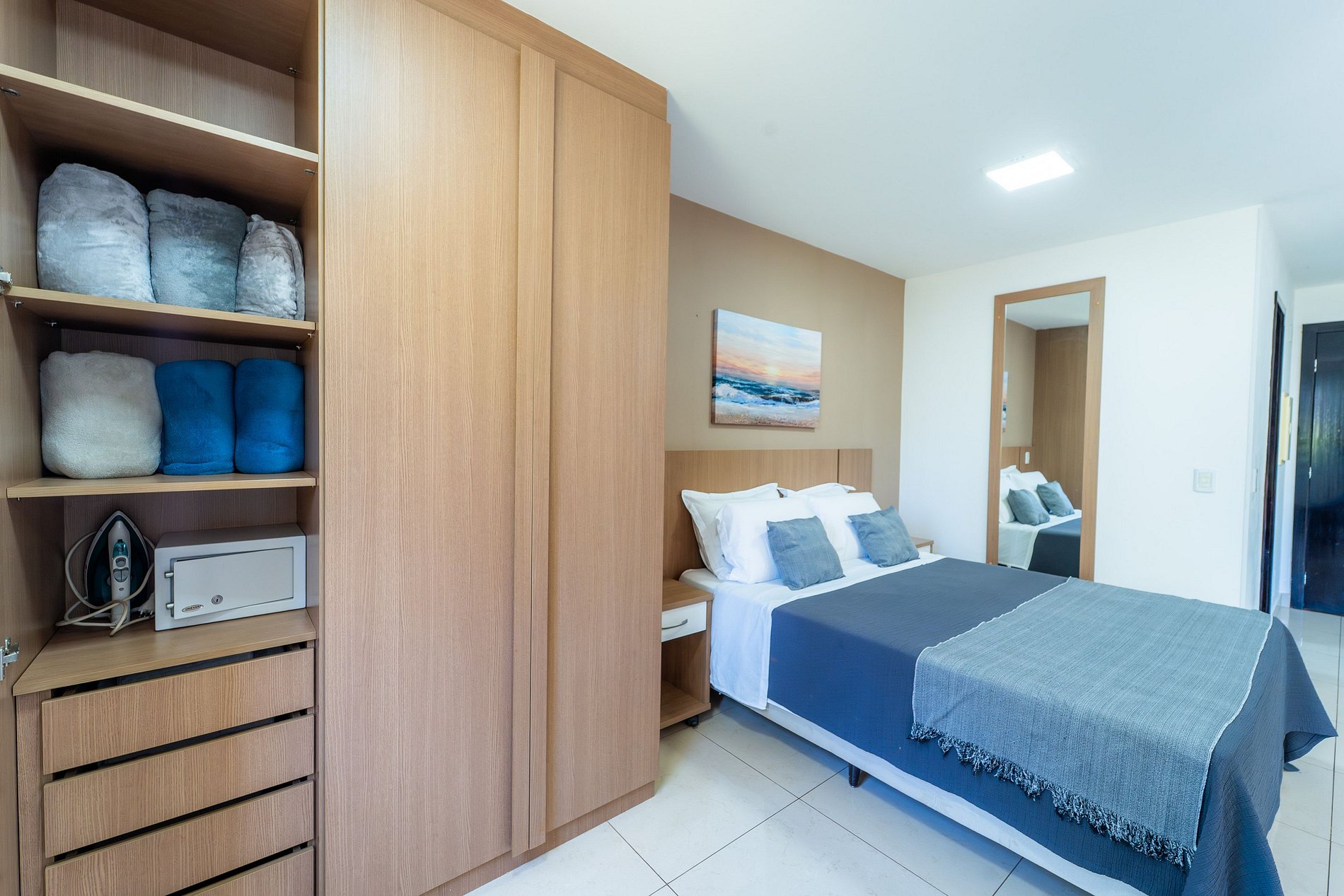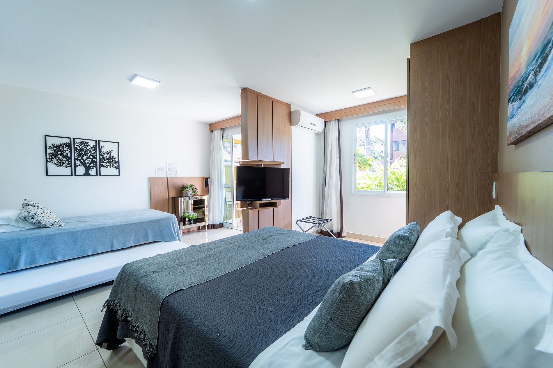 Apartamento de 36m² no térreo possui cama de casal queen, sofá cama casal e dois colchões, banheiro e cozinha equipada com geladeira, fogão duas bocas, sanduicheira, utensílios de cozinhas básicos como panelas, copos, pratos e talheres. Ferro de passar disponível mediante solicitação prévia. Tv com Globo Play. *Piscina climatizadas disponíveis para acesso dos hóspedes. Direito a uma vaga de garagem no estacionamento rotativo do condomínio.