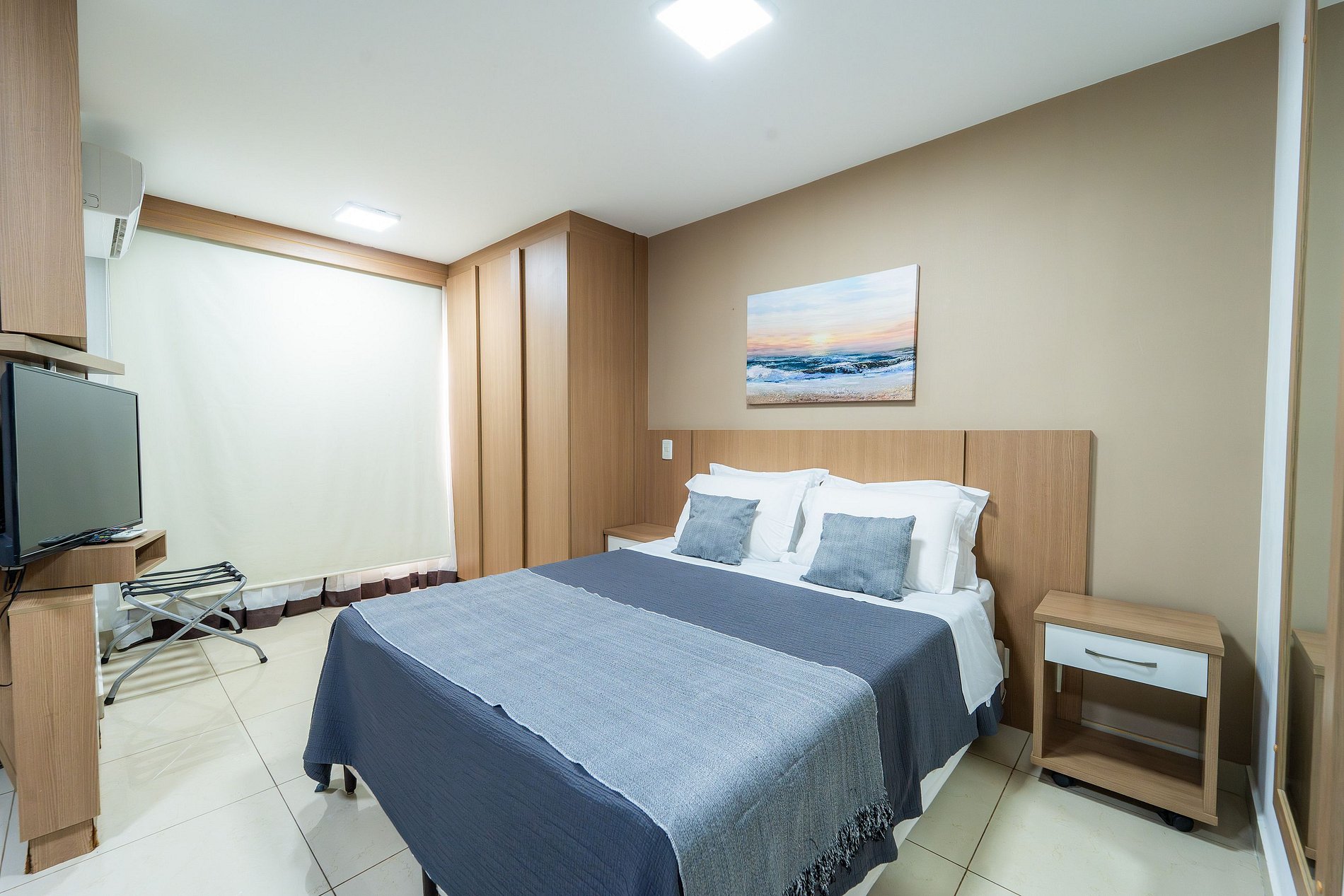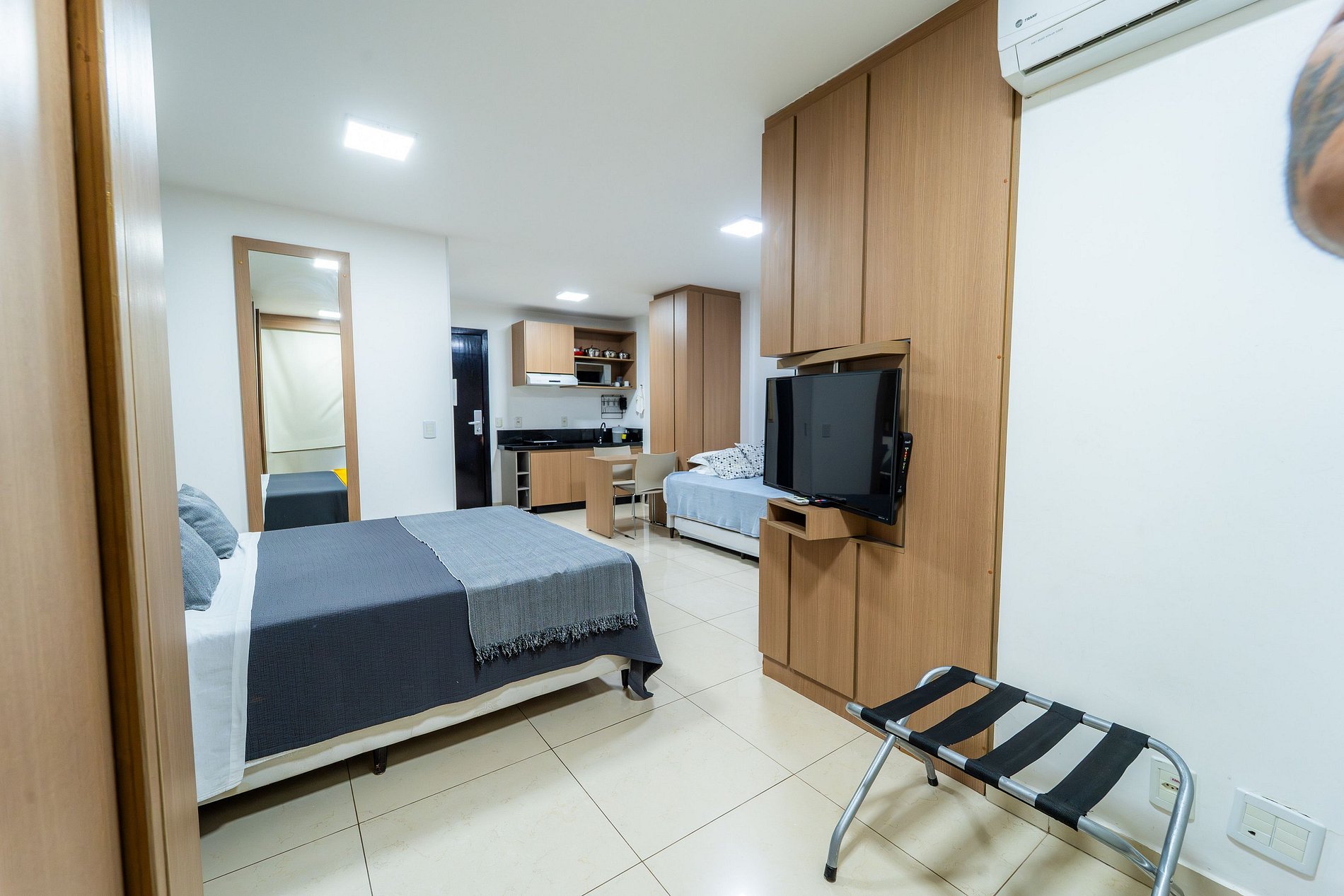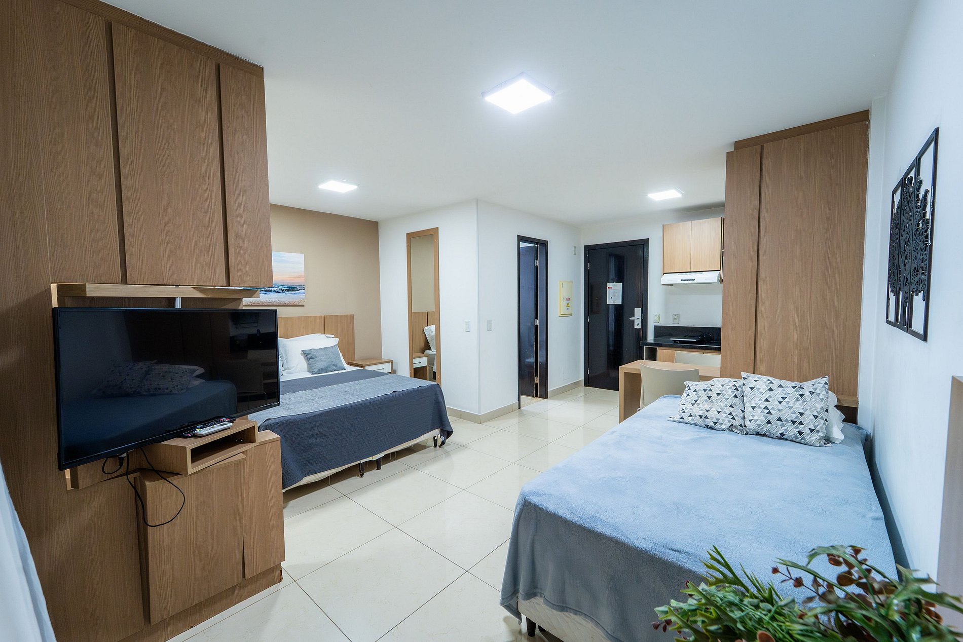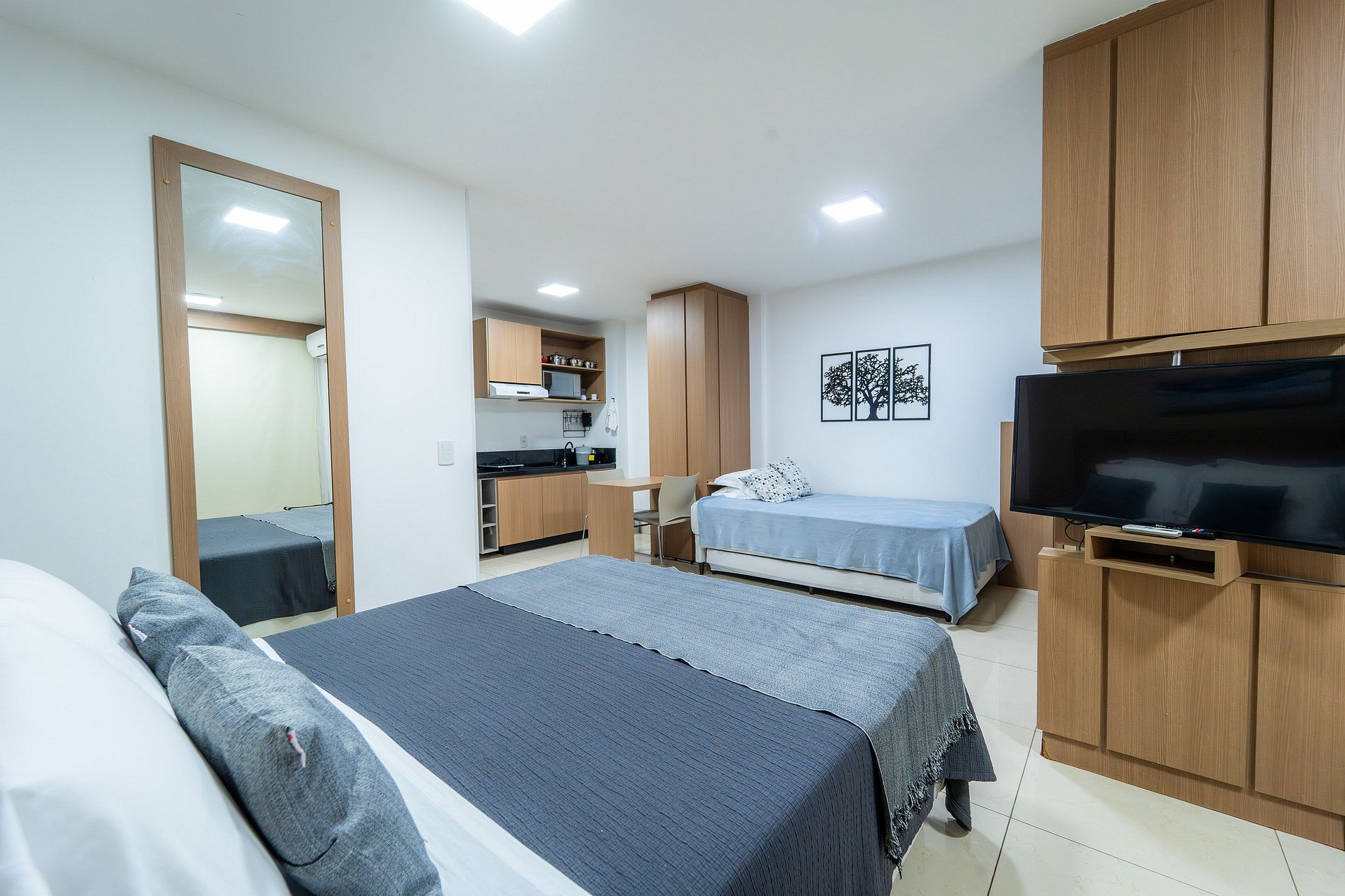 Apartamento de 36m² no térreo possui cama de casal queen, sofá cama casal e dois colchões, banheiro e cozinha equipada com geladeira, fogão duas bocas, sanduicheira, utensílios de cozinhas básicos como panelas, copos, pratos e talheres. Ferro de passar disponível mediante solicitação prévia. Tv com Globo Play. *Piscina climatizadas disponíveis para acesso dos hóspedes. Direito a uma vaga de garagem no estacionamento rotativo do condomínio.