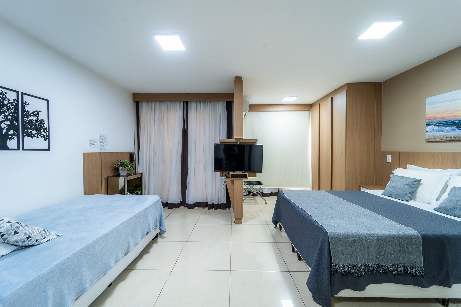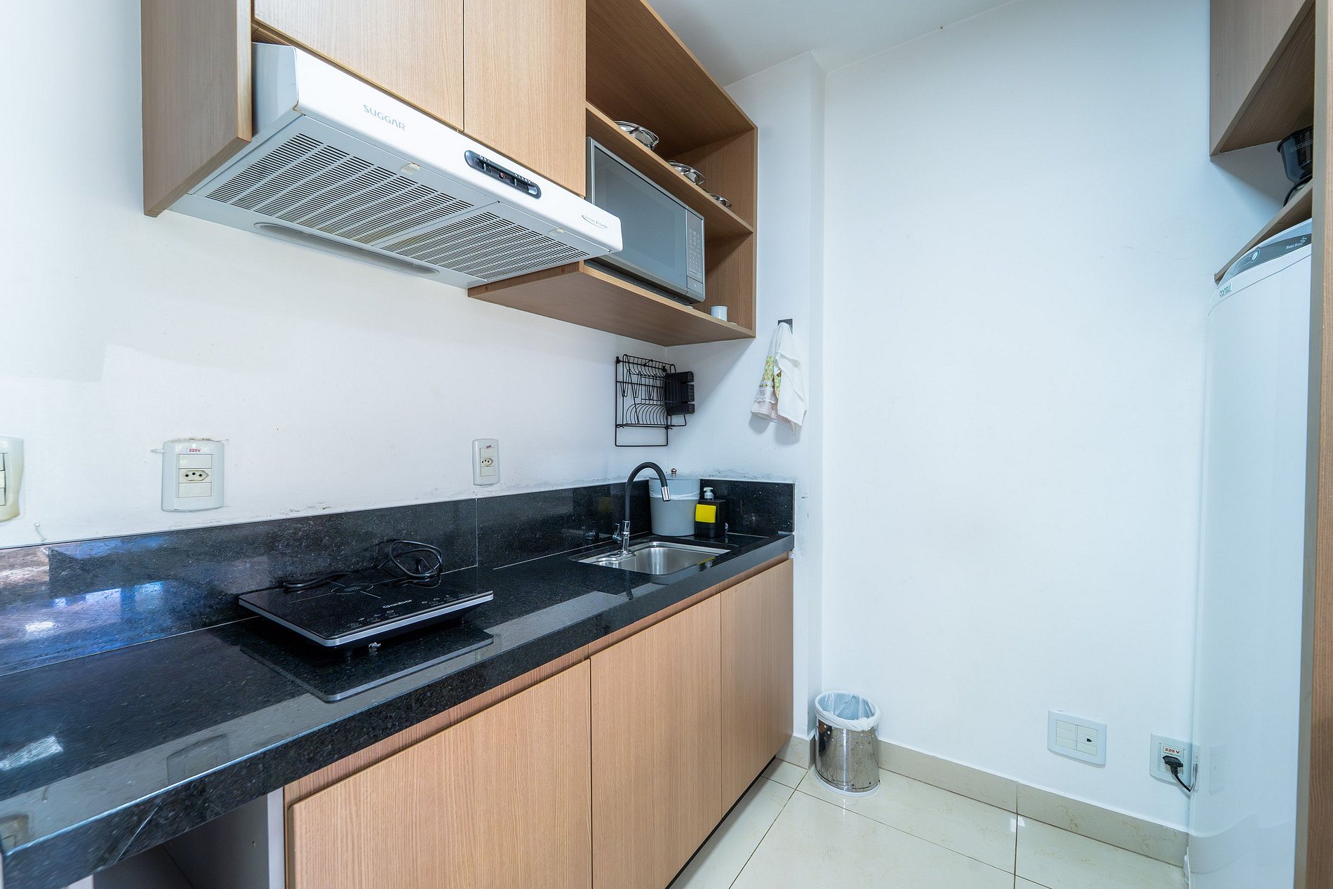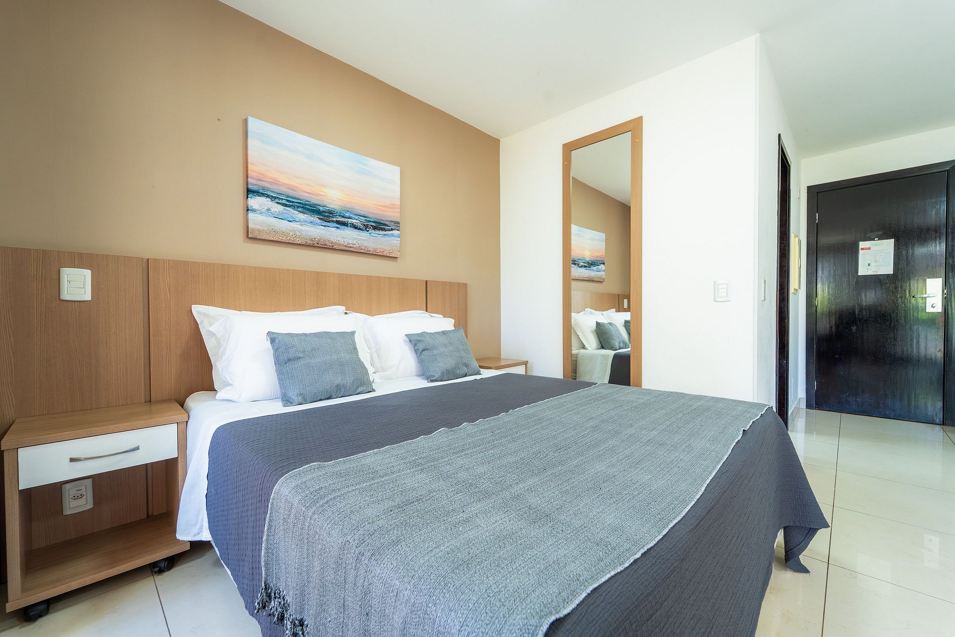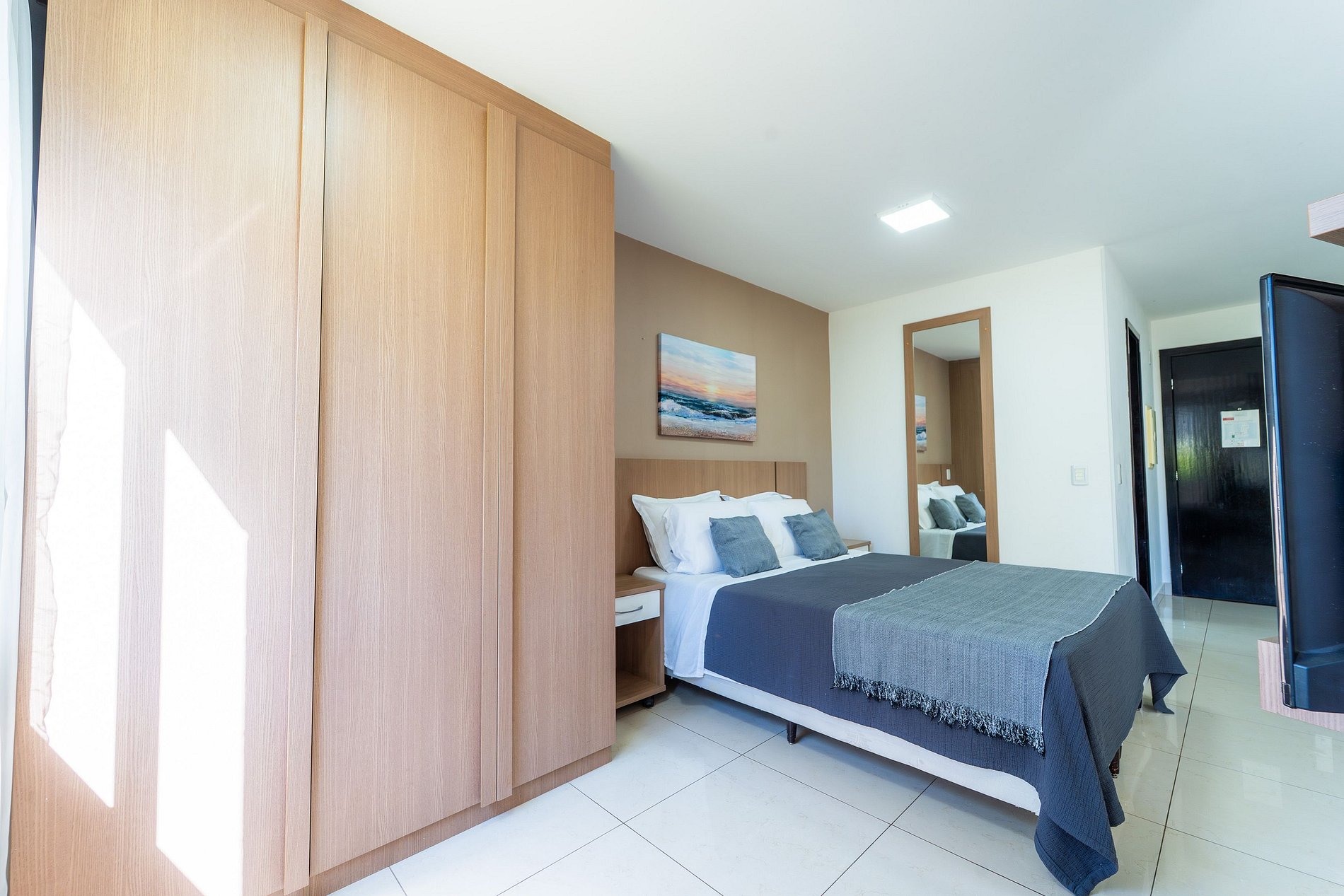 Apartamento de 36m² no térreo possui cama de casal queen, sofá cama casal e dois colchões, banheiro e cozinha equipada com geladeira, fogão duas bocas, sanduicheira, utensílios de cozinhas básicos como panelas, copos, pratos e talheres. Ferro de passar disponível mediante solicitação prévia. Tv com Globo Play. *Piscina climatizadas disponíveis para acesso dos hóspedes. Direito a uma vaga de garagem no estacionamento rotativo do condomínio.