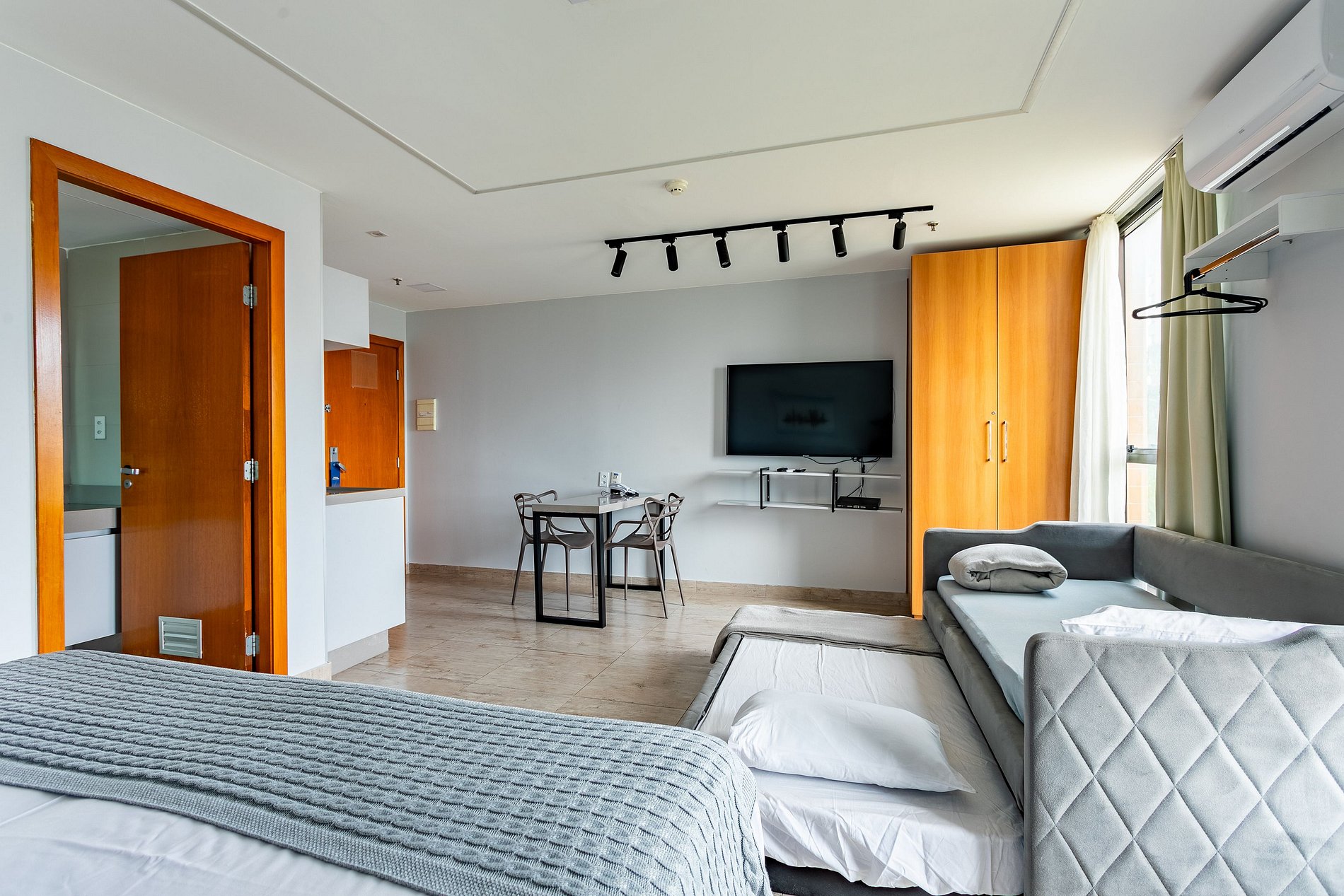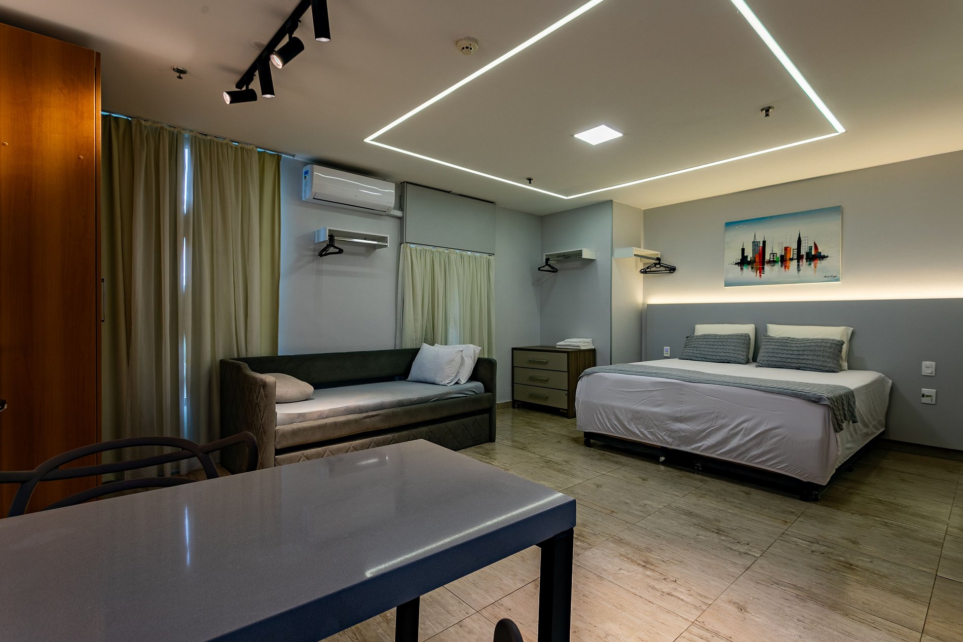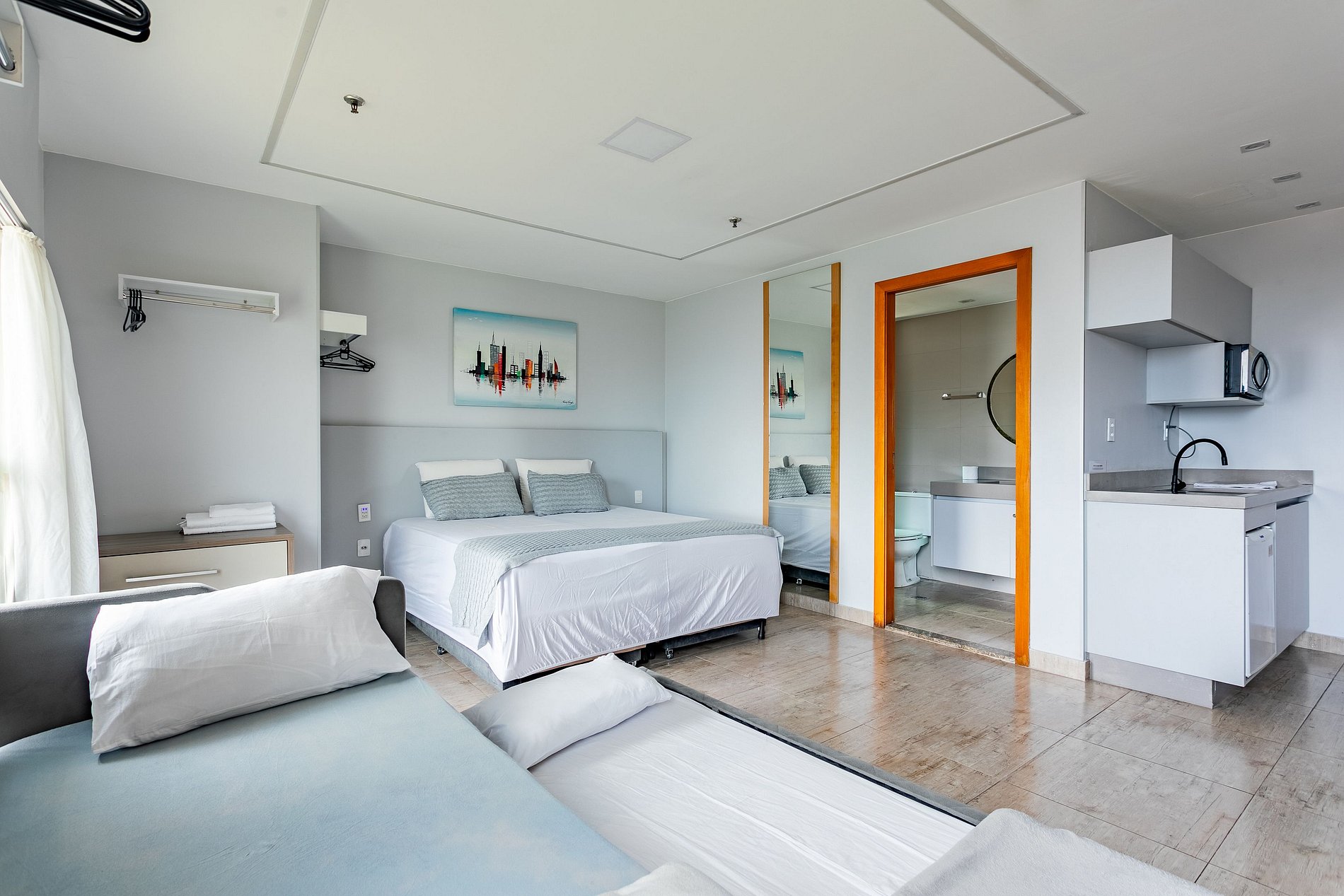 O quarto é moderno (reformado recentemente) e possuem ar-condicionado, TV smart, cozinha com microndas e frigobar. O hotel oferece serviço de quarto, sem troca de enxoval. As Camas são 3 de solteiro com auxiliares de visita sendo que 2 de solteiro formam 1 de casal.