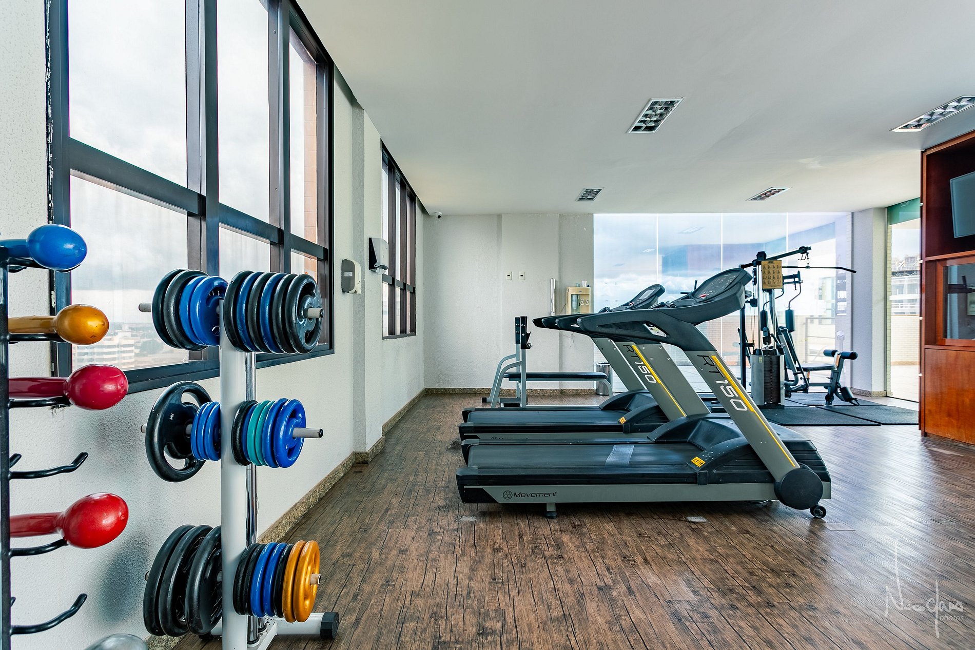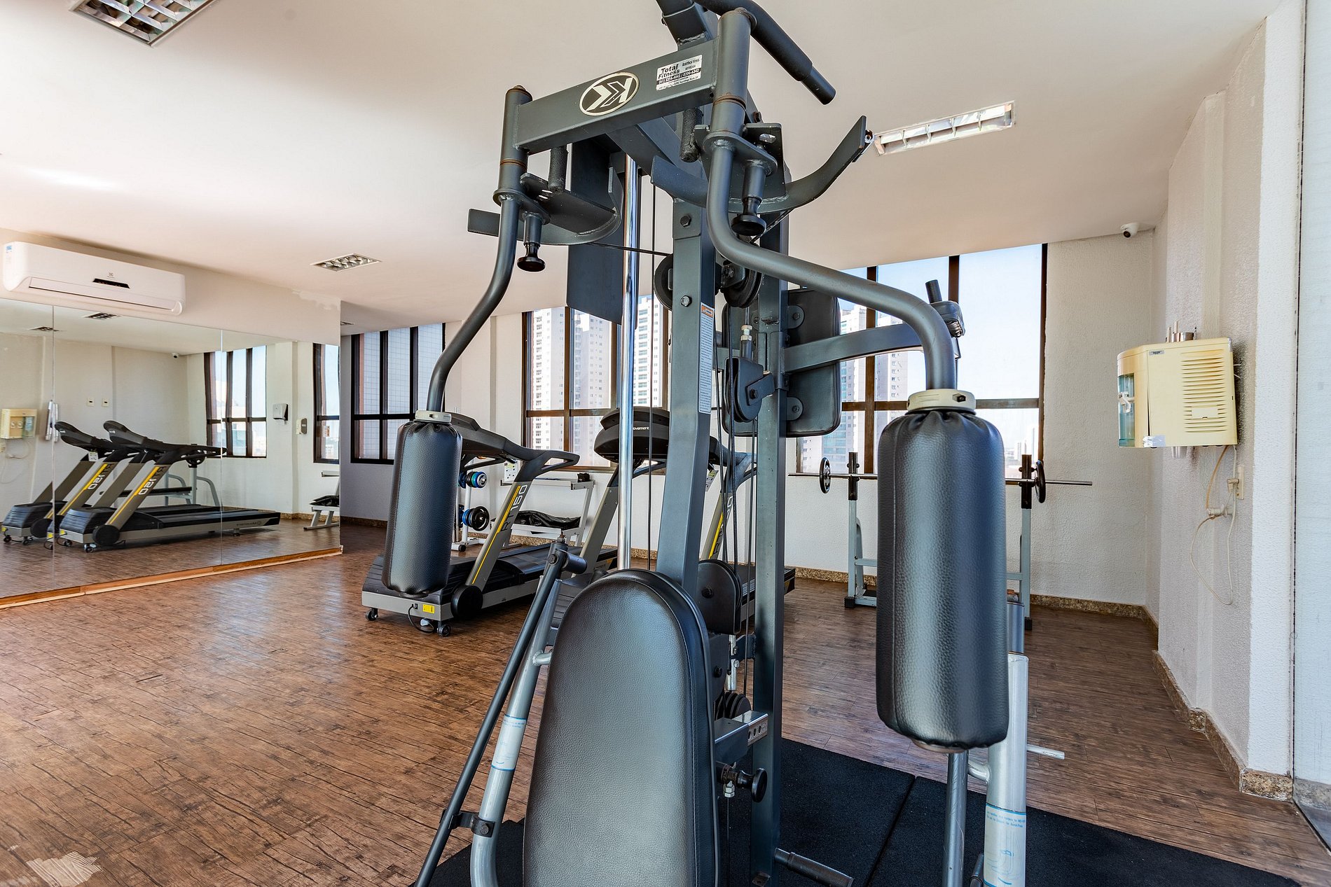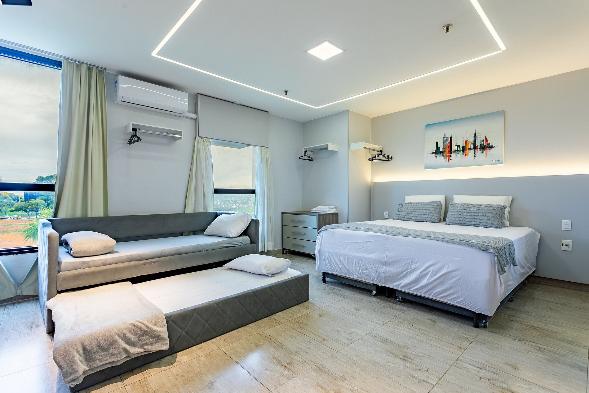 O quarto é moderno (reformado recentemente) e possuem ar-condicionado, TV smart, cozinha com microndas e frigobar. O hotel oferece serviço de quarto, sem troca de enxoval. São 3 camas de solteiro sendo que 2 formam a cama de casal, com 3 camas auxiliares de visita.