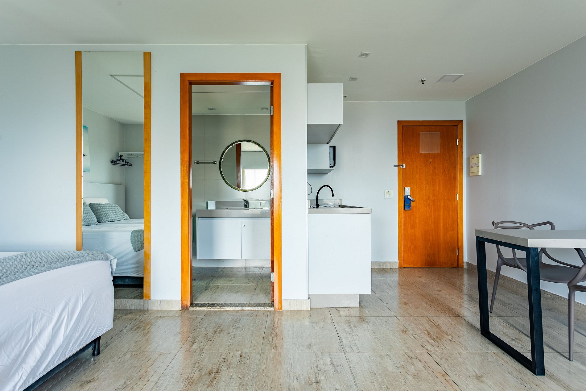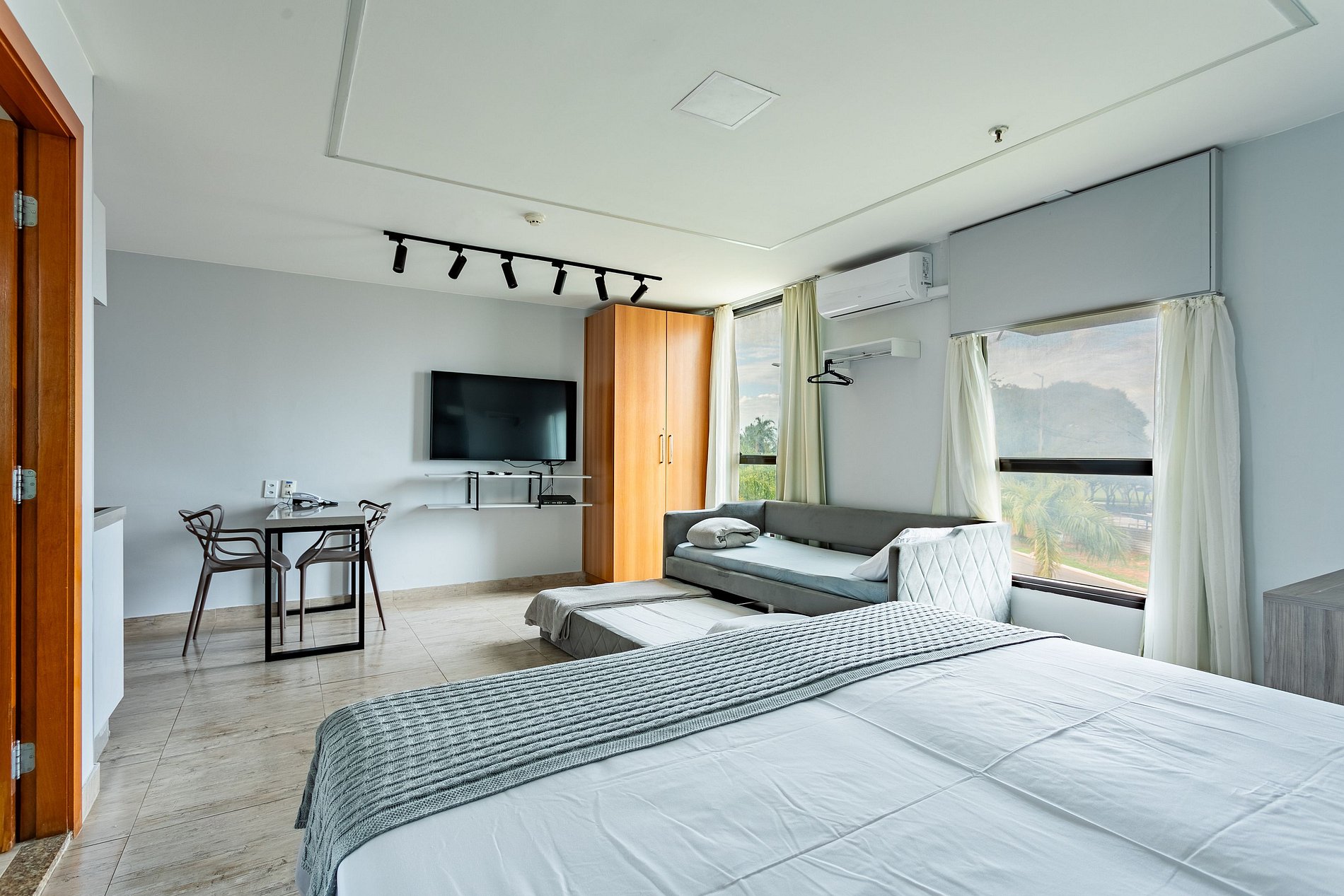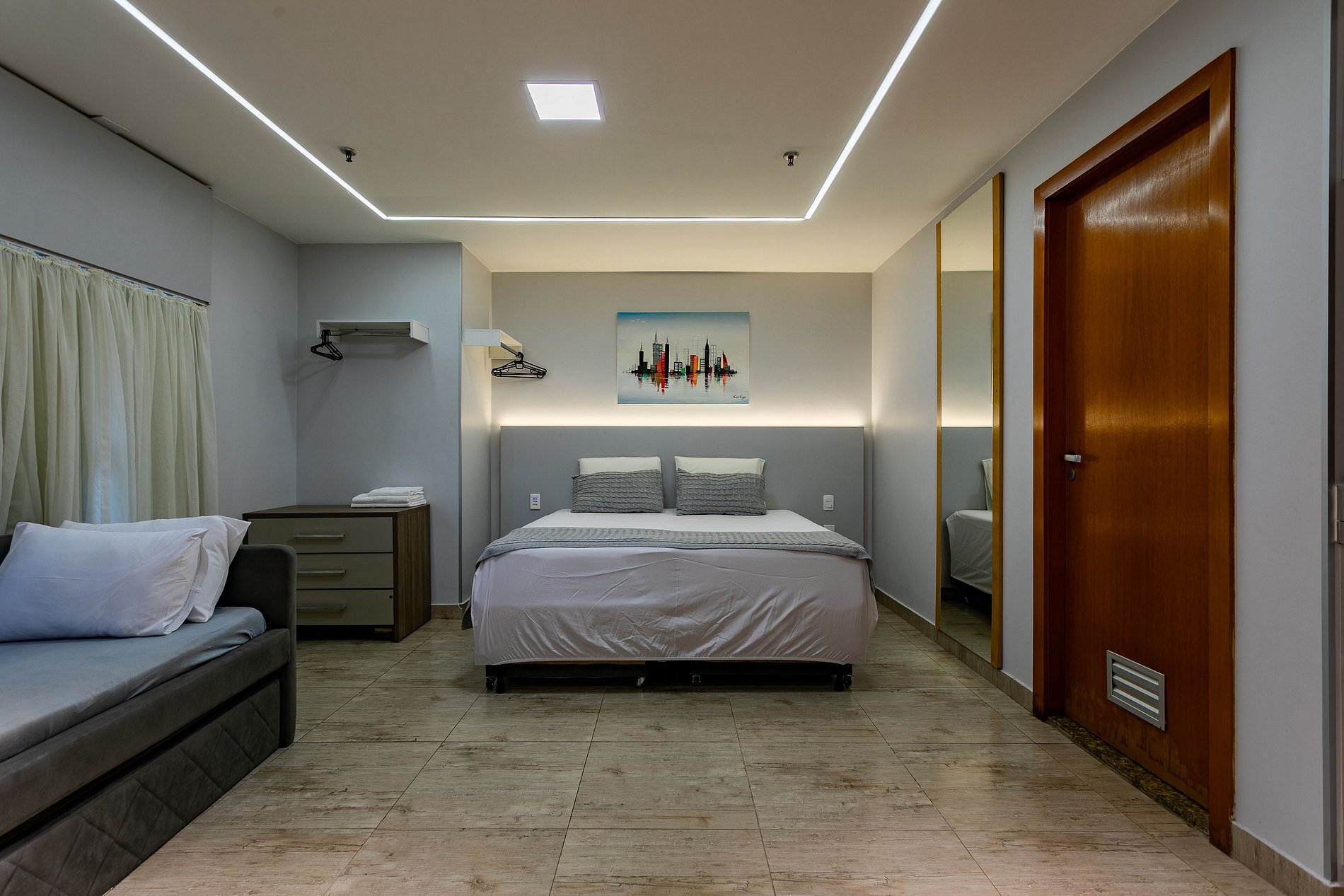 O quarto é moderno (reformado recentemente) e possuem ar-condicionado, TV smart, cozinha com microndas e frigobar. O hotel oferece serviço de quarto, sem troca de enxoval. As Camas são 3 de solteiro com auxiliares de visita sendo que 2 de solteiro formam 1 de casal.