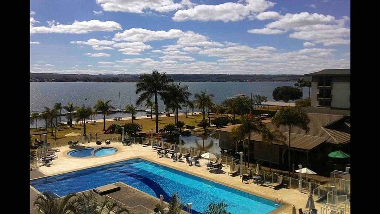 Apartamento 24 m² de frente para o Lago Paranoá (fotos da vista tiradas do próprio apt), que fica no principal bloco do resort MELHOR LOCALIZAÇÃO DENTRO DO CONDOMÍNIO (único com vista frontal). Dispõem de uma cama casal queen com duas camas auxiliares embaixo. Bem aconchegante e funcional. Ótima opção para quem vem de férias ou a trabalho. O condomínio é de alto padrão extremamente confortável e lindo!!! Com comodidade para toda família. Venha desfrutar!