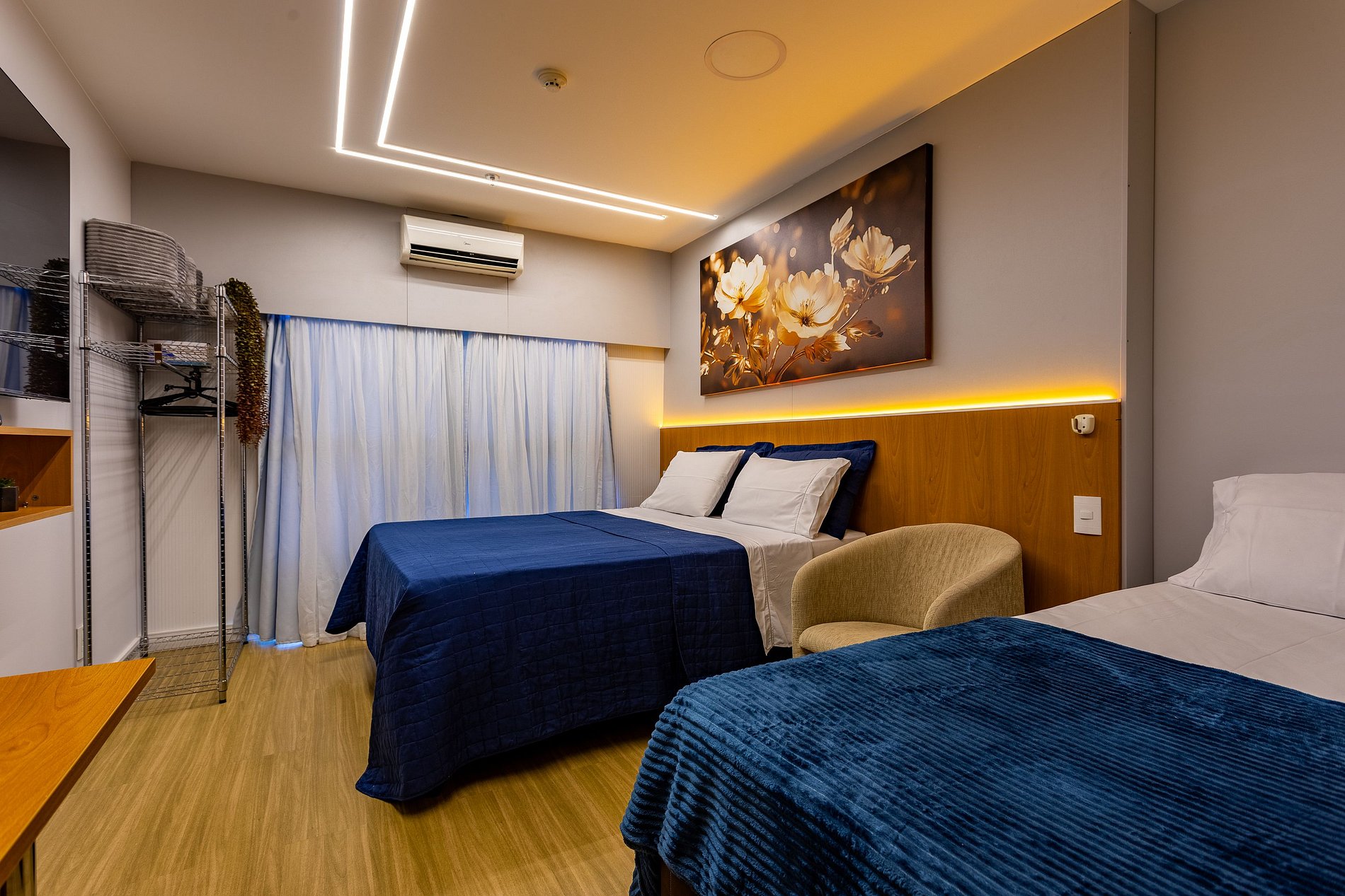 O apartamento é um espaço compacto e bem planejado, onde cada detalhe foi pensado para oferecer conforto e funcionalidade. o quarto conta com uma TV smart, perfeita para momentos de lazer, e um frigobar para manter suas bebidas e petiscos sempre à mão. Para o descanso dos nosso hospedes temos algo versátil, com uma cama king para noites de sono relaxantes, além de uma cama de solteiro e um futon que podem ser ajustados conforme suas necessidades. Para quem precisa trabalhar ou estudar, há uma escrivaninha prática. O banheiro é funcional e bem equipado, enquanto o armário oferece bastante espaço para armazenamento. O ar condicionado garante um ambiente sempre agradável,Este é um lugar onde conforto e praticidade se encontram de maneira harmoniosa.